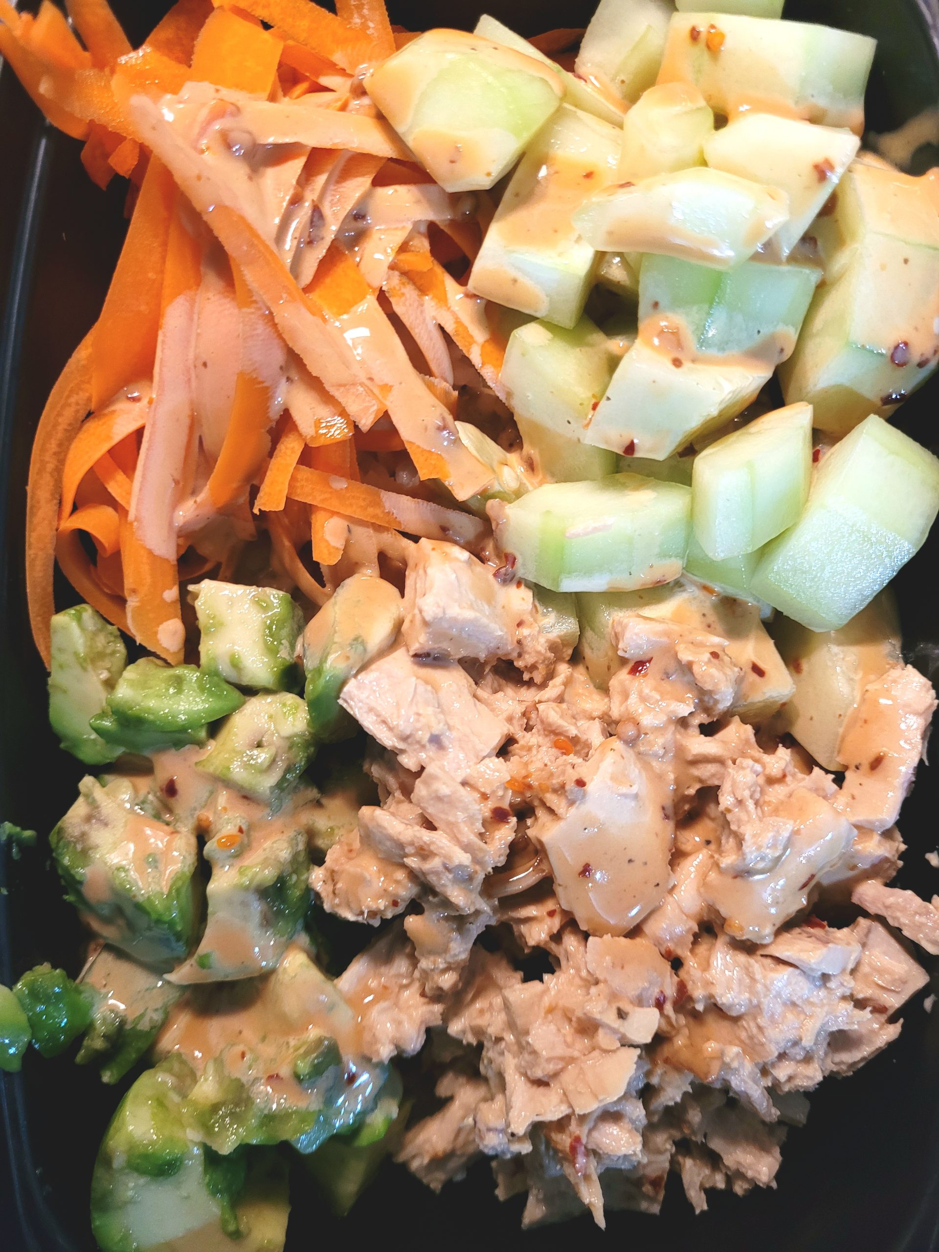 While the rice is cooking, combine the mayo, soy sauce, toasted sesame oil, and hot sauce or chili crisp in a small dish, stirring or whisking until smooth. Set aside. Cut the avocado into small cubes using your preferred method. Squeeze a bit of juice from half of the lemon onto the avocado and toss gently to prevent browning. Set aside. (I used the rest of the juice from this half in my tea, but you can use it however you like.) Make the carrot into thin strips using a vegetable peeler. Set aside. Peel the cucumber and remove the seeds. Cut into small cubes and set aside. Open the can of tuna and drain. Flake with a fork into a small dish, leaving the chunks fairly large. Toss with about 1/3 of the sauce mixture and set aside.